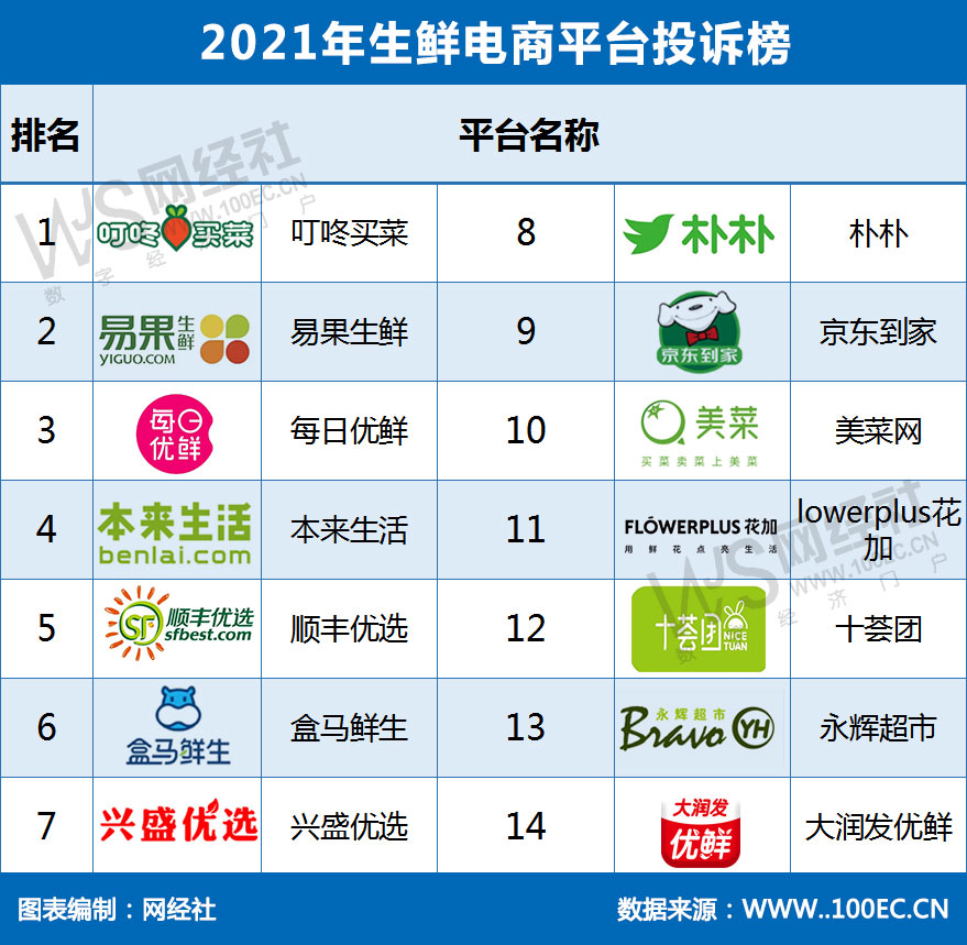 据国内知名网络消费纠纷调解平台“电诉宝”显示,2021年依据投诉量来排名,涉及的生鲜电商平台有叮咚买菜、易果生鲜、每日优鲜、本来生活、顺丰优选、盒马鲜生、兴盛优选、朴朴、京东到家、美菜网、Flowerplus花加、十荟团、永辉超市、大润发优鲜等。