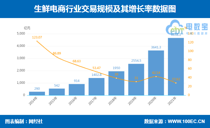 据网经社“电数宝”(DATA.100EC,CN)电商大数据库显示, 2021年生鲜电商交易规模达4658.1亿元,同比增长27.92%。