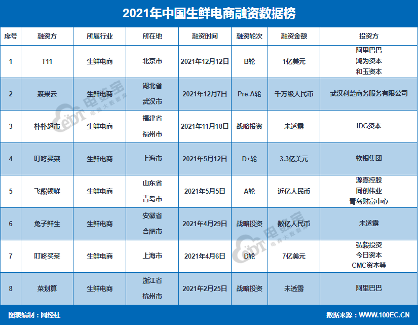 据网经社“电数宝”电商大数据库显示,2021年,国内生鲜电商行业共发生了8起投融资事件,融资总额超80.5亿元。