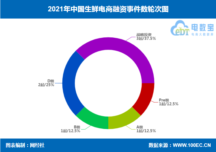 网经社“电数宝”电商大数据库显示,2021年生鲜电商融资事件共8起,其中,A轮1起、B轮1起、D轮2起、战略投资3起、Pre级1起。