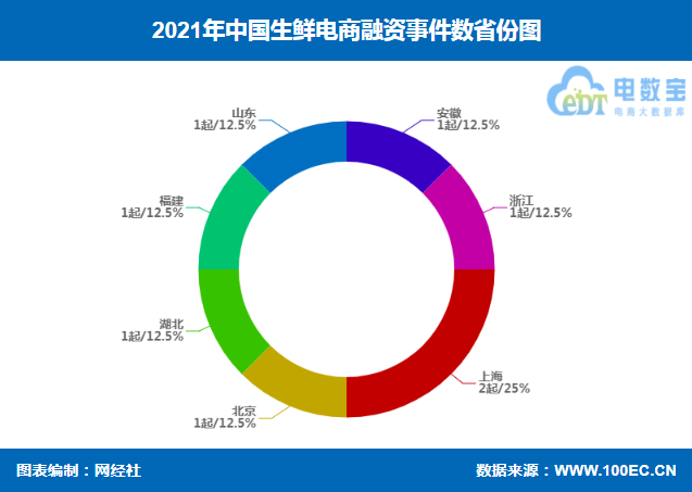 据网经社“电数宝”电商大数据库显示,2021年生鲜电商融资省份主要分布在上海、北京、安徽、山东、福建、浙江、湖北,其中,上海融资次数最多,为2起,融资额最高,为70.5亿;北京、山东、安徽、浙江、福建、湖北各1起,融资额除浙江、福建未透露外,北京省为6.8亿元;安徽省为2亿元;山东省为1亿元;湖北省为0.1亿元。
