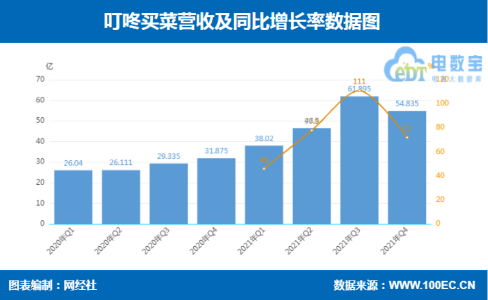 2021年四季度叮咚买菜总营收为54.835亿元人民币,与2020年同期的31.875亿元人民币相比增长72%。净亏损为10.963亿元人民币,而2020年同期净亏损为12.455亿元人民币,同比下降11.979%。不按美国通用会计准则,净亏损为10.341亿元人民币,而2020年同期净亏损为12.388亿元人民币。