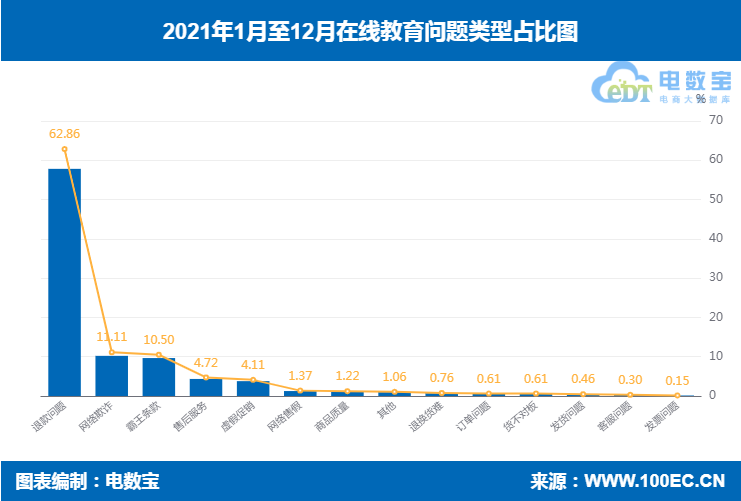 据“电诉宝”显示,2021年全国在线教育用户投诉问题类型排名依次为:退款问题(62.86%)、网络欺诈(11.11%)、霸王条款(10.50%)、售后服务(4.72%)、虚假促销(4.11%)、网络售假(1.37%)、商品质量(1.22%)、其他(1.06%)、退换货难(0.76%)、订单问题(0.61%)、货不对板(0.61%)、发货问题(0.46%)、客服问题(0.30%)、发票问题(0.15%)。