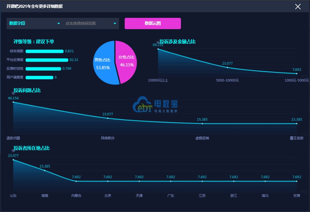 据网经社旗下电商大数据库“电数宝”监测数据显示,2021年“开课吧”共获得7次消费评级,6次获“建议下单”,1次获“谨慎下单”,2021 年整体消费评级为“建议下单”评级 。
