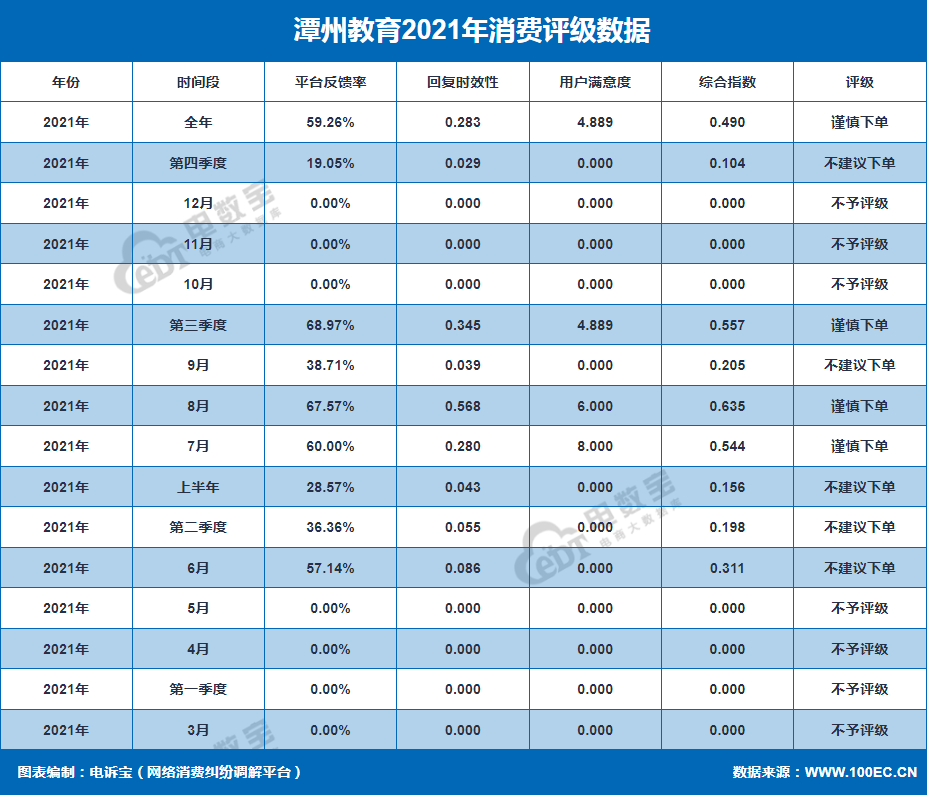 据网经社旗下电商大数据库“电数宝”监测数据显示,2021年“潭州教育”共 获得16次消费评级,其中 5次获“不建议下单”评级, 4次获“谨慎下单”评级,7次获“不予评级”评级,2021 年整体消费评级为“谨慎下单”。