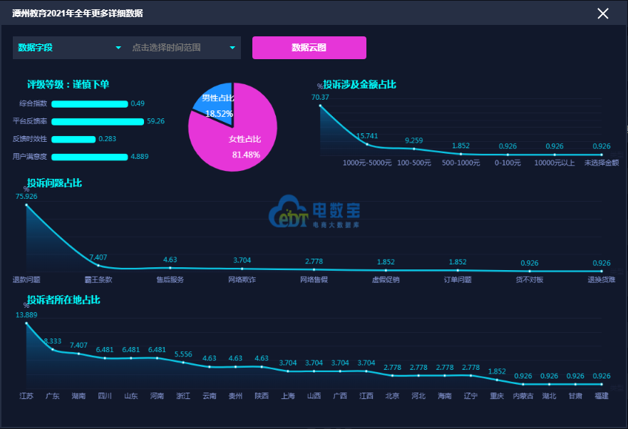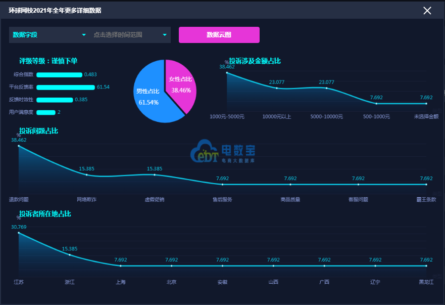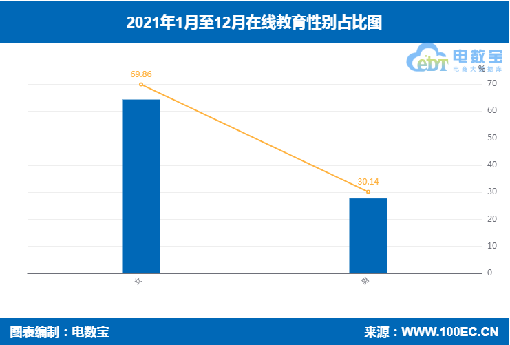 据“电诉宝”显示,2021年在线教育女性用户投诉比例为69.86%,男性用户投诉比例为30.14%。