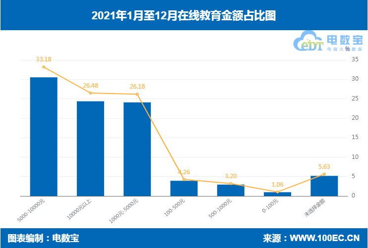 据“电诉宝”显示,2021年在线教育投诉金额分布主要集中在5000-10000元(33.18%)、10000元以上(26.32%)、1000-5000元(26.18%)、100-500元(4.26%)、500-1000元(3.20%)、0-100元(1.06%)、未选择金额(5.63%)。