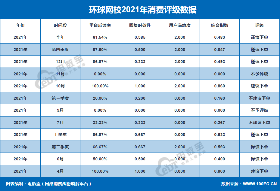 据“电数宝”监测数据显示,2021年“环球网校”获得12次消费评级,其中2次获“不建议下单”评级,2次获“建议下单评级”评级,6次获“谨慎下单”评级,2次获“不予评级”评级,2021 年整体消费评级为“谨慎下单”。