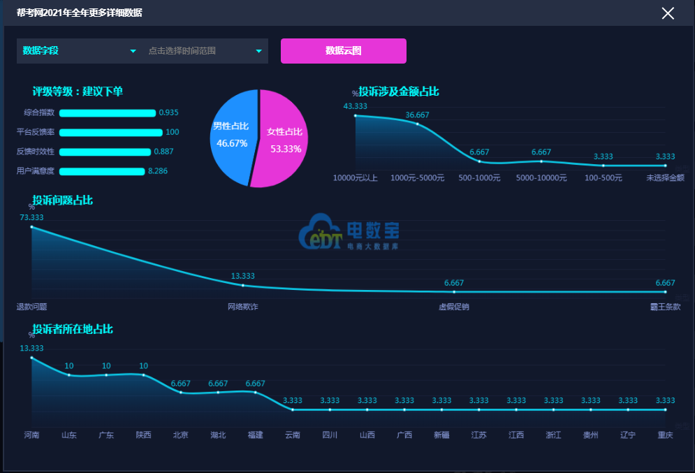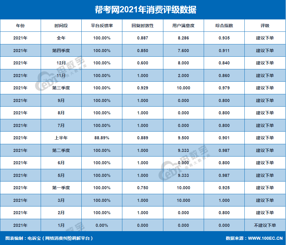 据网经社旗下电商大数据库“电数宝”监测数据显示,2021年“帮考网”共获得15次消费评级,14次获“建议下单”,1次获“不建议下单”,2021 年整体消费评级为“建议下单”评级 。