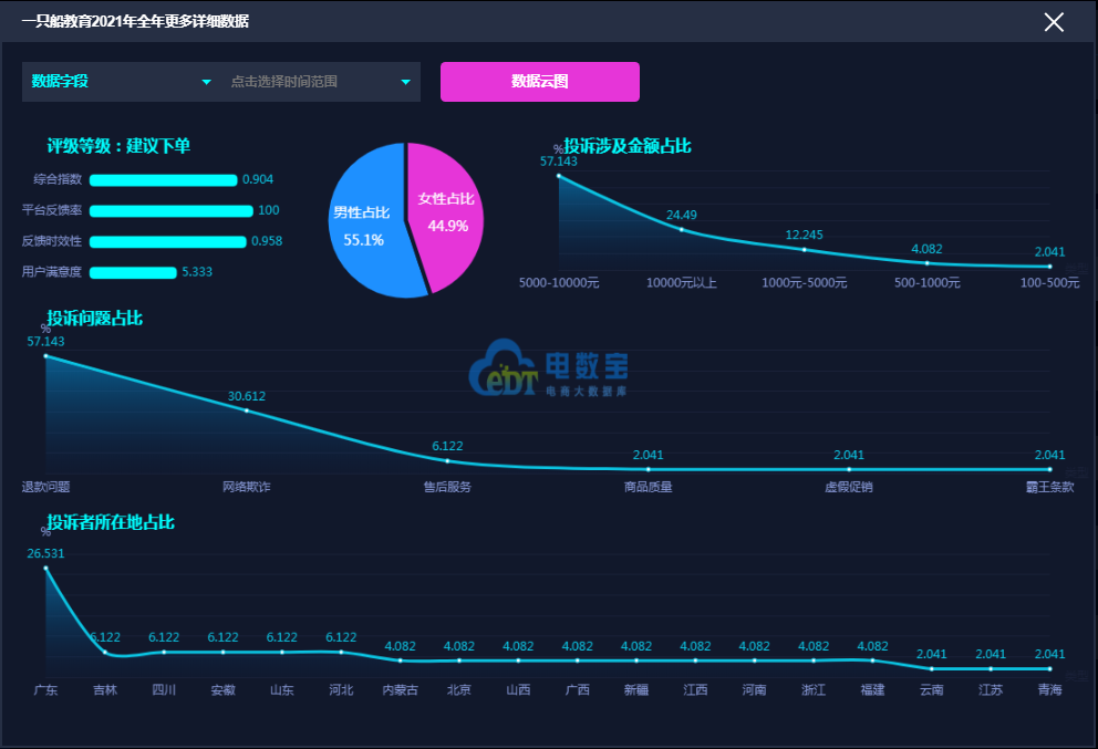 据网经社旗下电商大数据库“电数宝”监测数据显示,2021年“一只船教育”共获得8次消费评级,7次获“建议下单”,1次获“谨慎下单”,2021 年整体消费评级为“建议下单”评级 。