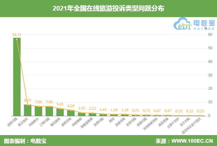 据“电诉宝”显示,2021年全国在线旅游用户投诉问题类型排名前十的依次为:退款问题(56.71%)、霸王条款(8.23%)、网络欺诈(7.06%)、订单问题(7.06%)、售后服务(5.41%)、虚假促销(4.24%)、网络售假(2.35%)、高额退票费(2.12%)、发票问题(1.41%)、其它(1.18%)。