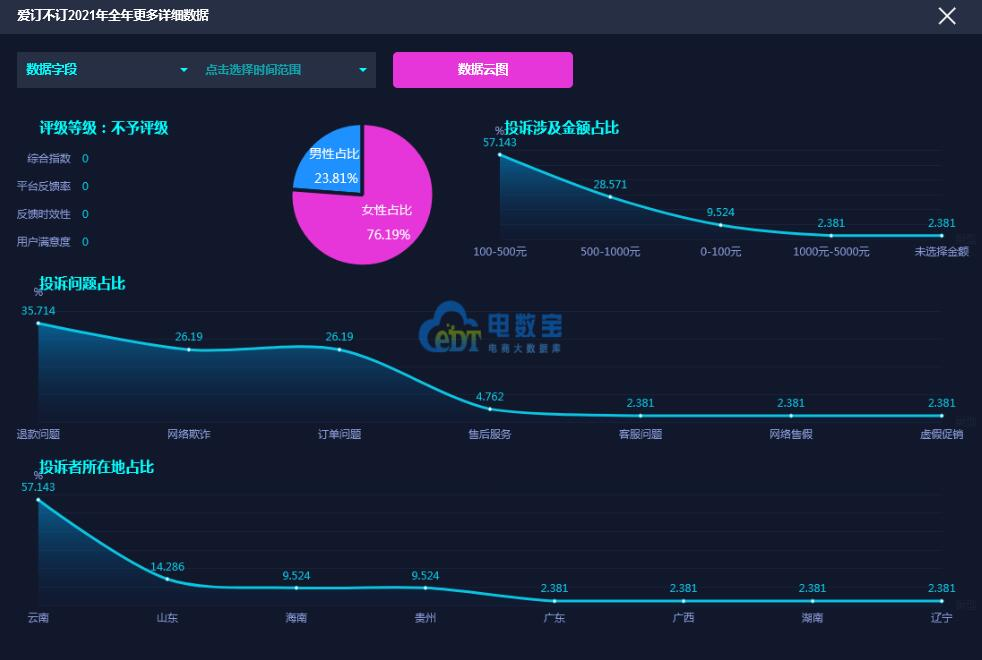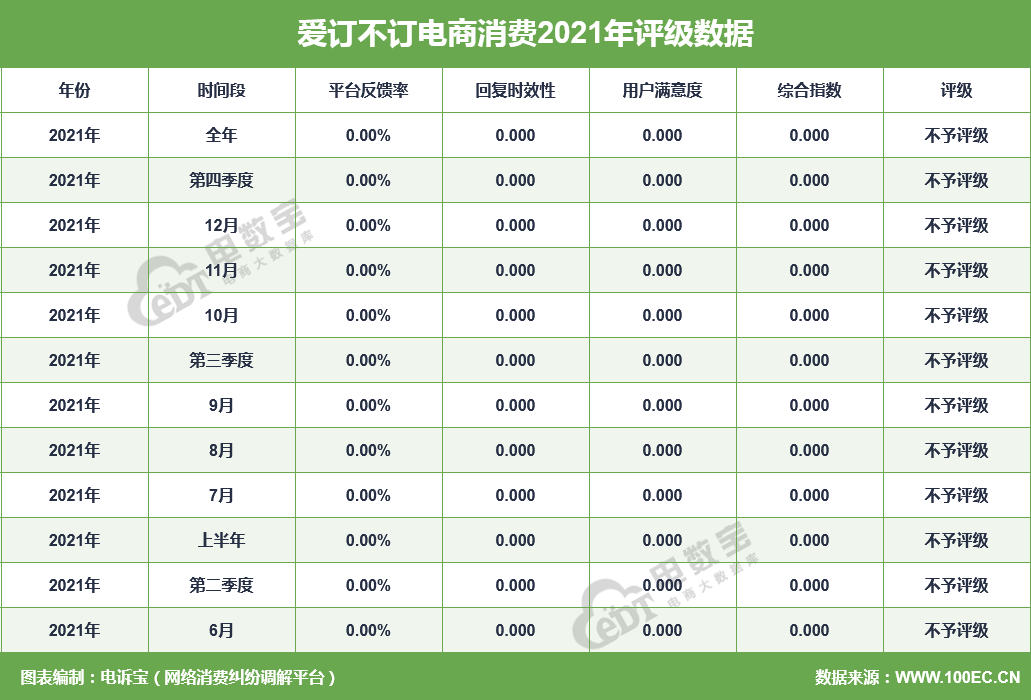 据网经社旗下电商大数据库“电数宝”监测数据显示,2021年“爱订不订”共获得12次消费评级,均获“不予评级”。同时,“爱订不订”存在退款问题、网络欺诈、订单的问题。