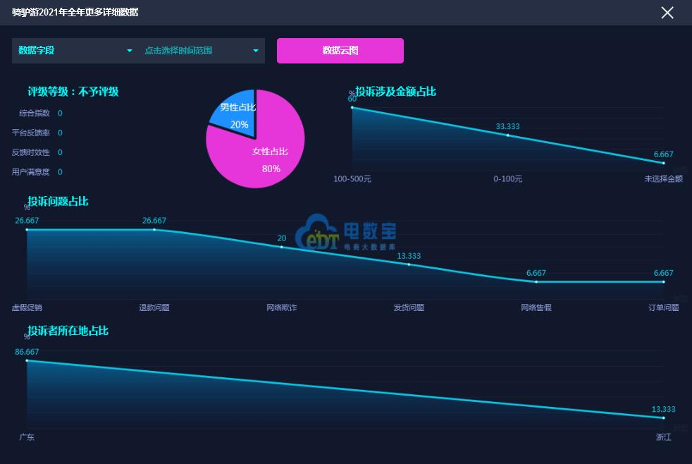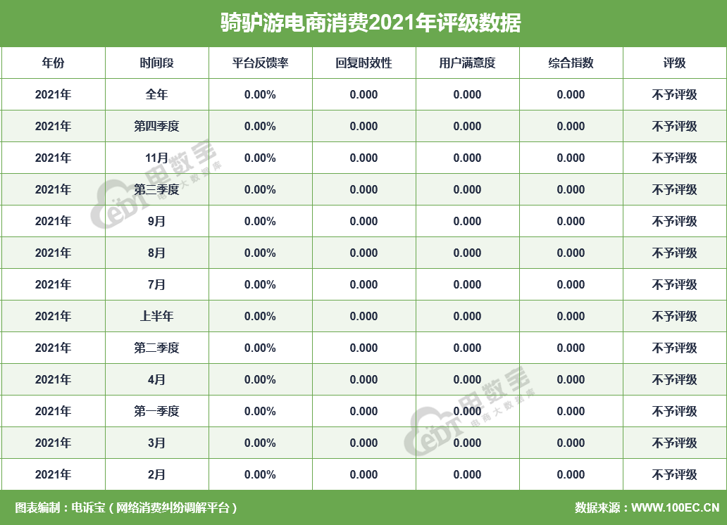 据网经社旗下电商大数据库“电数宝”监测数据显示,2021年“骑驴游”共获得13次消费评级,均获“不予评级”。同时,“骑驴游”存在虚假促销、退款问题、网络欺诈的问题。