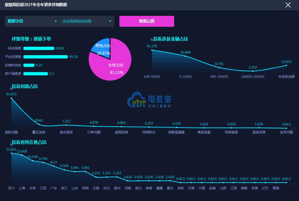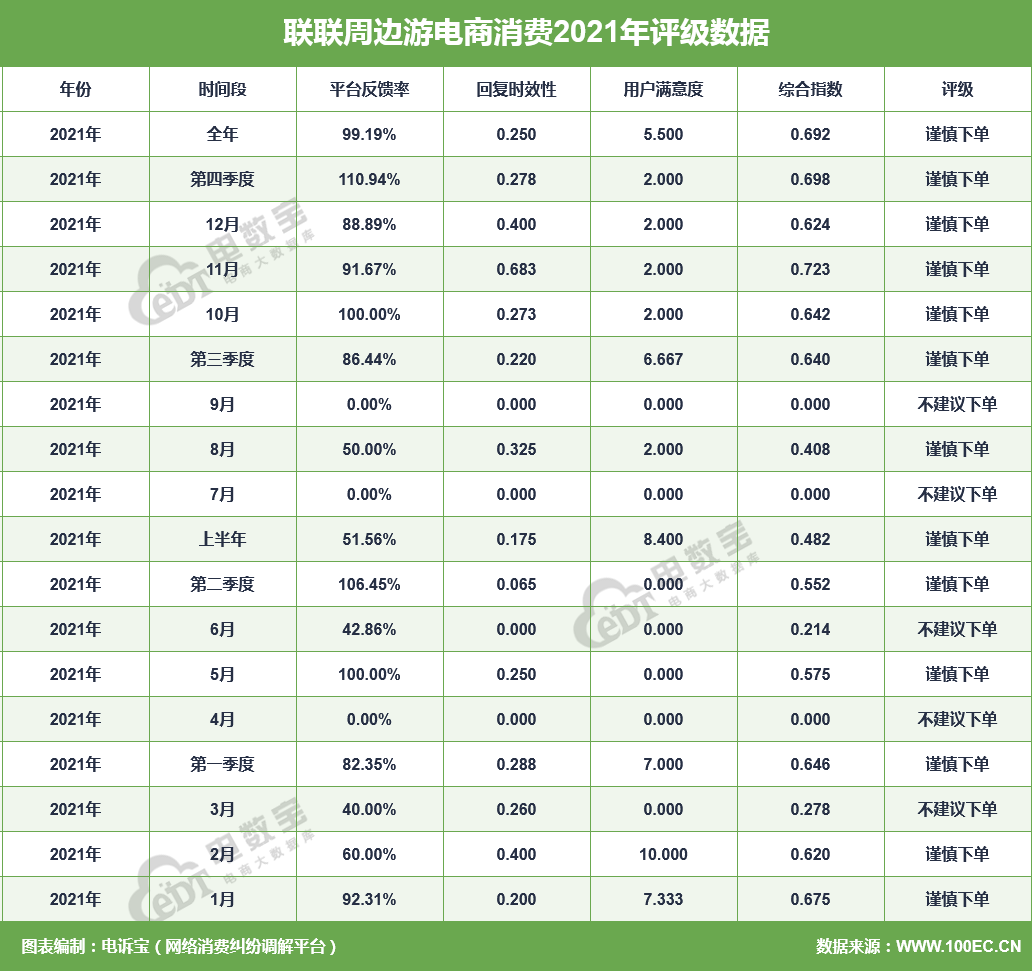 据网经社旗下电商大数据库“电数宝”监测数据显示,2021年 “联联周边游”共获得18次消费评级,其中13次获“谨慎下单”评级、5次获“不建议下单”评级,最终获“谨慎下单”评级。同时,“联联周边游”存在退款问题、霸王条款、售后服务的问题。