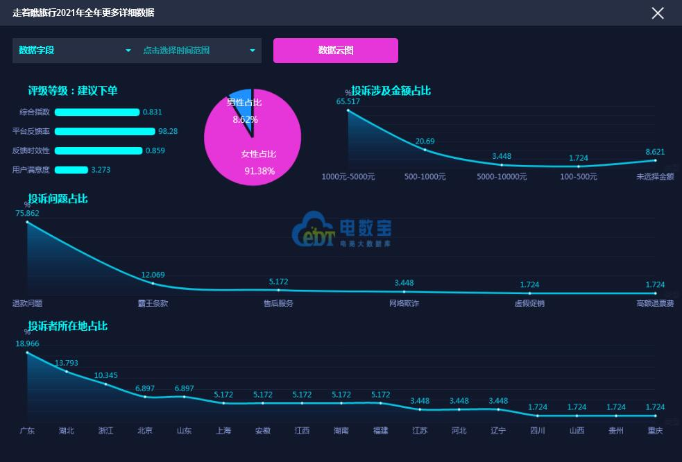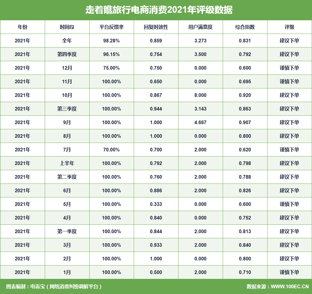 据网经社旗下电商大数据库“电数宝”监测数据显示,2021年“走着瞧旅行”共获得18次消费评级,其中,13次获“建议下单”评级、5次获“谨慎下单”评级。同时,“走着瞧旅行”存在退款问题、霸王条款、售后服务的问题。