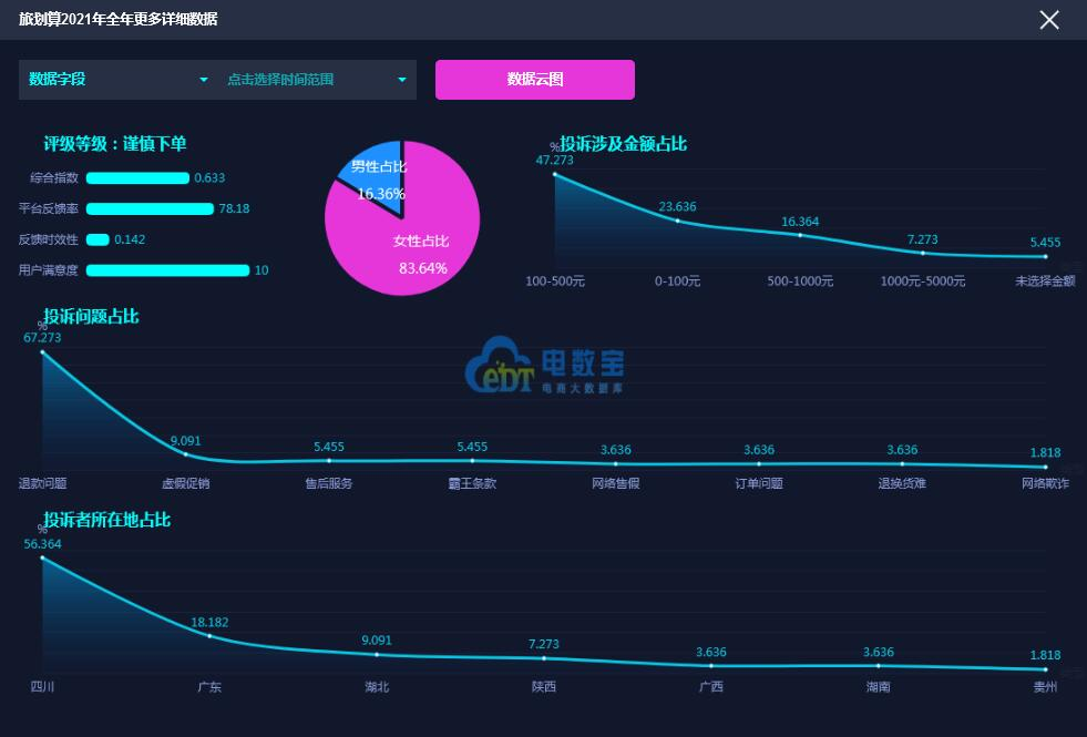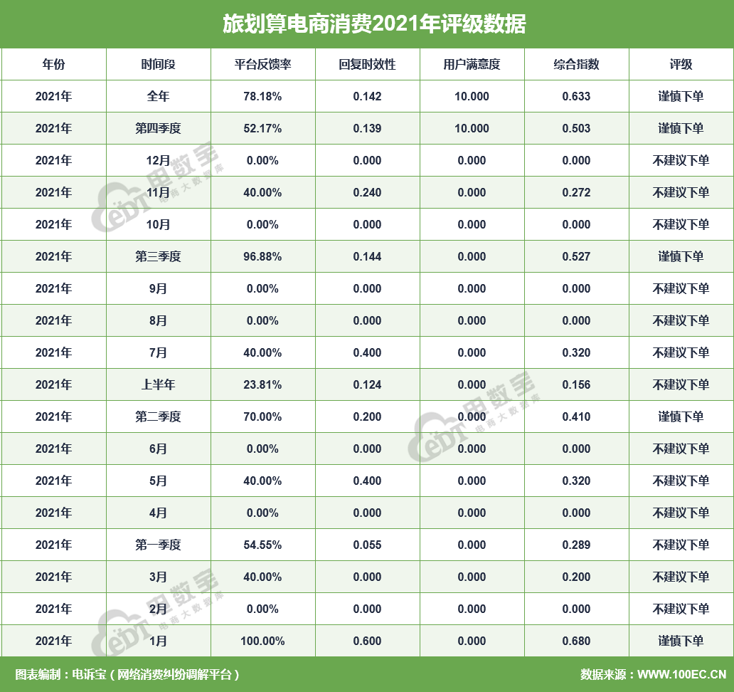 据网经社旗下电商大数据库“电数宝”监测数据显示,2021年“旅划算”共获得18次消费评级,其中,13次获“建议下单”评级、5次获“谨慎下单”评级,最终获“谨慎下单”评级。同时,“旅划算”存在退款问题、虚假促销、售后服务的问题。