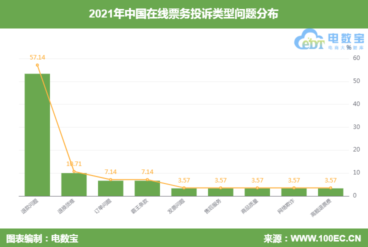 据“电诉宝”显示,2021年全国在线票务用户投诉问题类型排名依次为:退款问题(57.14%)、退换货难(10.71%)、订单问题(7.14%)、霸王条款(7.14%)、发票问题(3.57%)、售后服务(3.57%)、商品质量(3.57%)、网络欺诈(3.57%)、高额退票费(3.57%)。