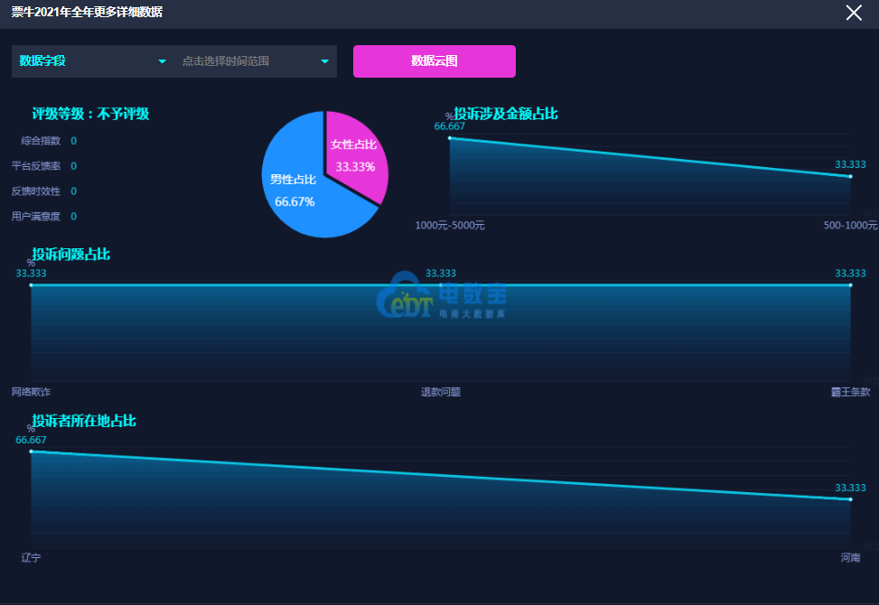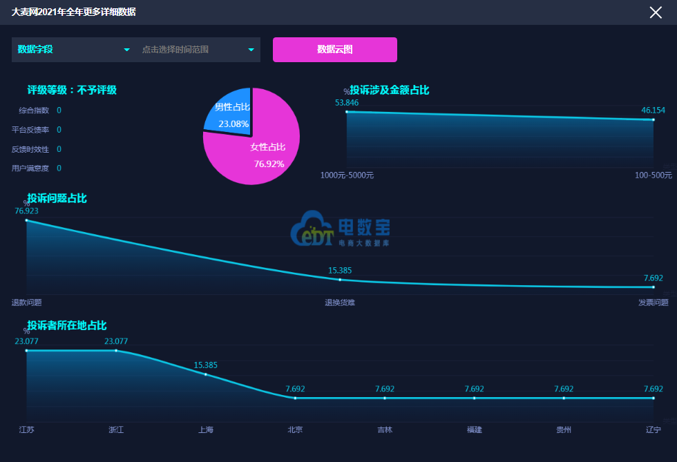 据“电诉宝”显示,2021年用户投诉大麦网的问题类型主要集中于退款问题、退换货难、发票问题;“电诉宝”受理投诉用户聚集地区为江苏、浙江、上海、北京、吉林、福建、贵州、辽宁等;其中,女性用户投诉比例为76.92%,男性用户投诉比例为23.08%;投诉金额分布于1000-5000元、100-500元。