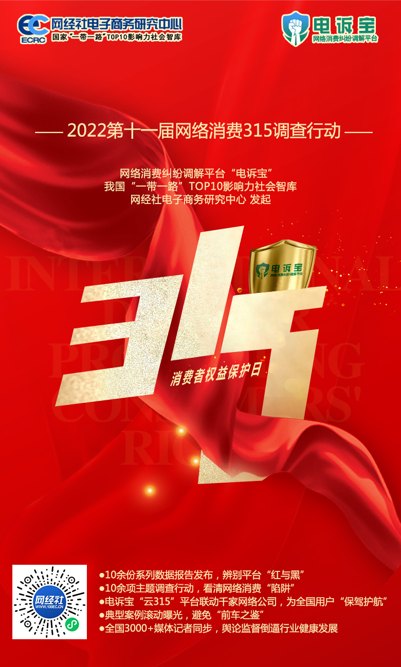 一年一度的3·15“国际消费者权益日”来临,平台经济互联网企业迎来大考,哪些会成为市场监管、消协点名、央视3·15晚会等舆论关注的焦点?为此,数字经济门户网经社旗下全国知名网络消费纠纷调节平台“电诉宝”,携手我国“一带一路”TOP10影响力社会智库网经社电子商务研究中心,共同发起“2022第十一届网络消费315调查行动”。