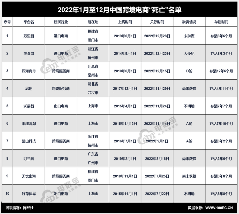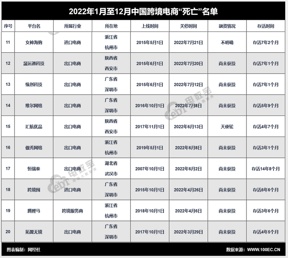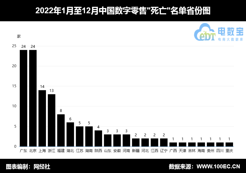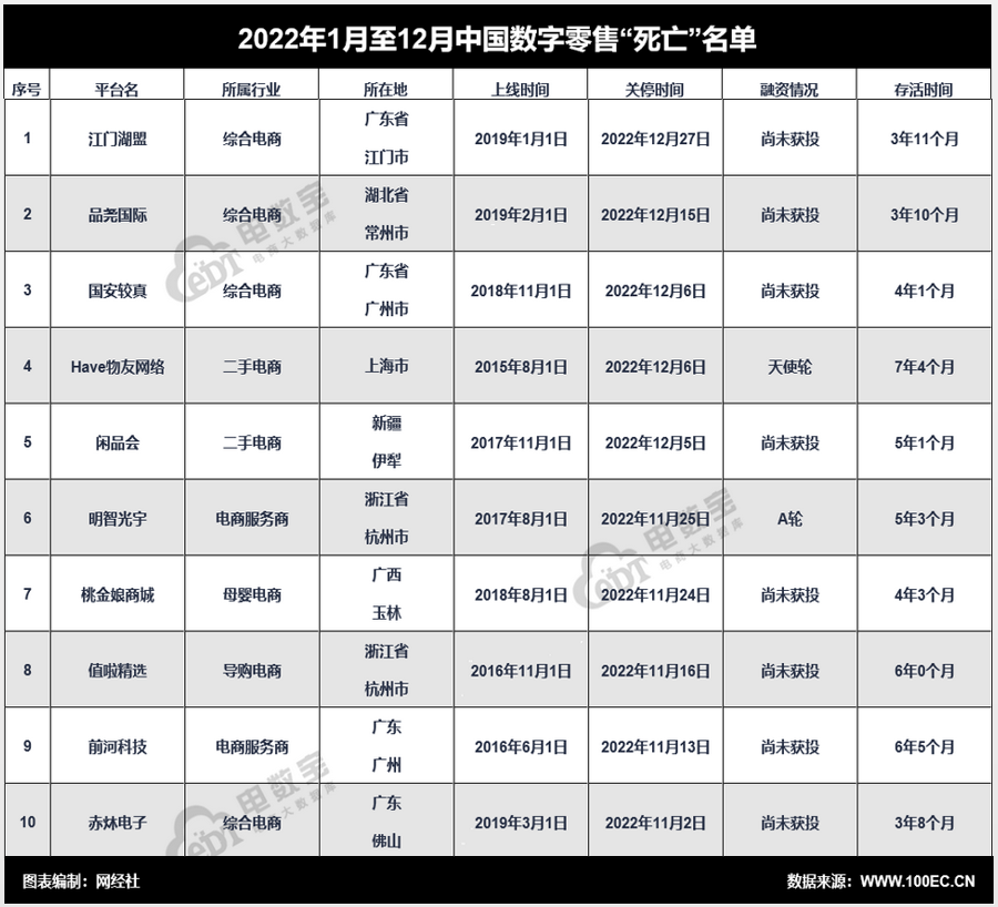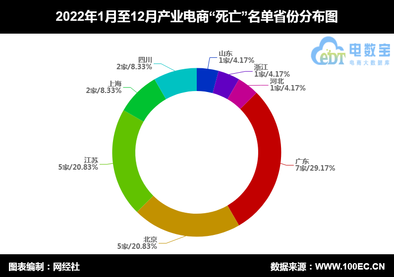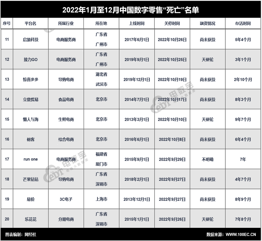 从行业分布上来看,导购电商“死亡”数量最多,达到32家;综合电商20家,位于第二;电商服务商12家,位列第三。此外,社交电商12家,生鲜电商8家,食品电商6家,服装电商、3C电子各5家,社区团购4家,酒水电商、二手电商、母婴电商、分期电商各3家,直播电商、农村电商、文玩电商、奢侈品电商各2家,宠物电商、玩具电商、美妆电商各1家。