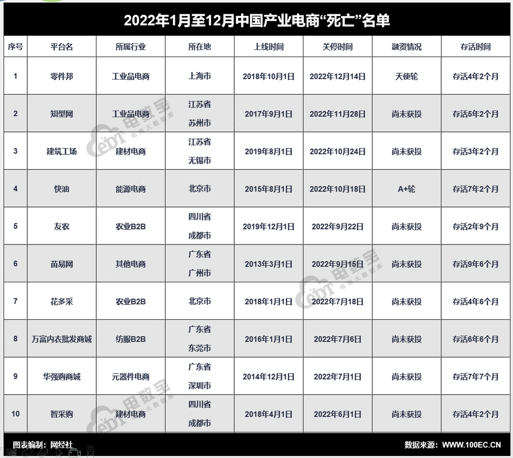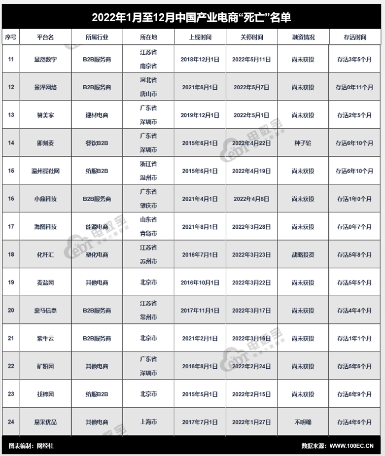 行业分布上,B2B服务商5家、建材电商3家、纺服B2B3家、能源电商2家、工业品电商2家、农业B2B2家、塑化电商1家、元器件电商1家、其他B2B电商4家。
