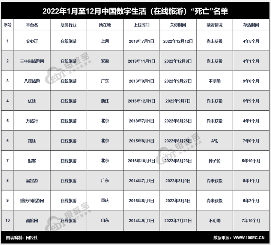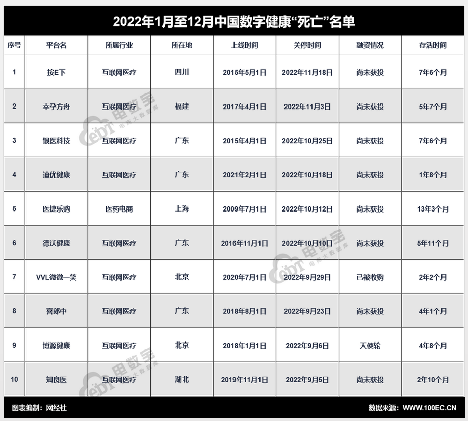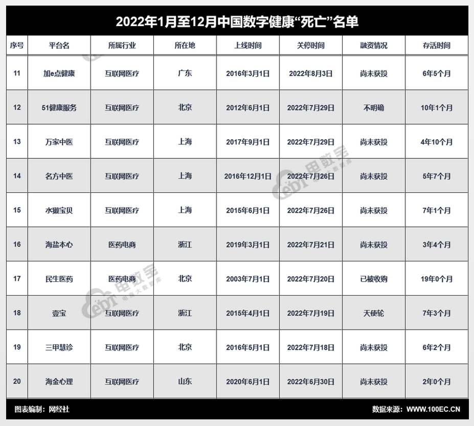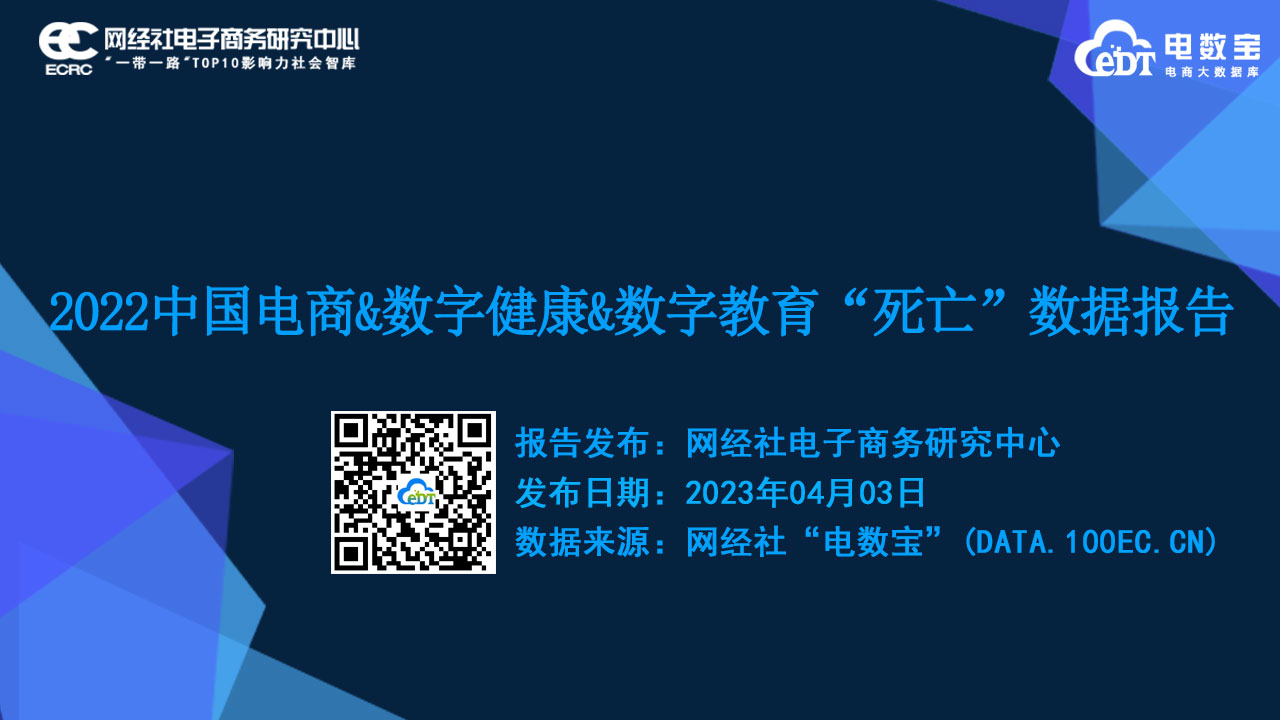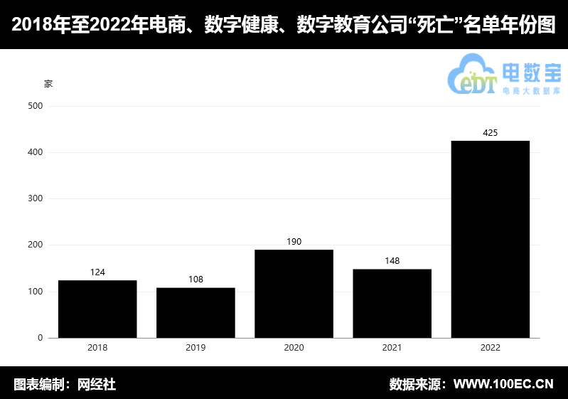 “电数宝”数据显示,2022年电子商务、数字健康、数字教育三大领域公司“死亡”数425家,同比扩大187.16%。2018年至2021年“死亡”数分别为124家、108家、190家、148家。可以看出,疫情三年期间,2022年“死亡”公司数超过2020年和2021年“死亡”数总和。
