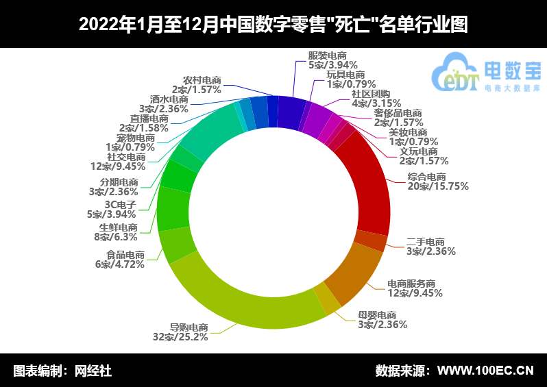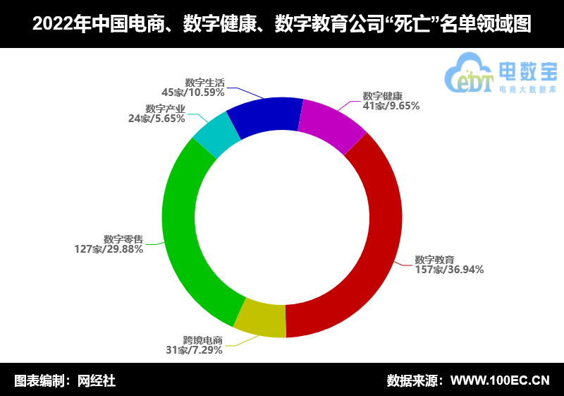 在2022年425家“死亡”公司中,数字零售127家,占比29.88%;数字教育157家,占比36.94%;数字生活45家,占比10.59%;数字健康41家,占比9.65%;产业电商24家,占比5.65%,跨境电商31家,占比7.29%。