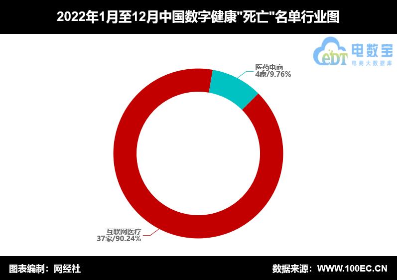 数字健康“死亡”公司行业分布上,互联网医疗公司“死亡”数37家,占比90.24%;医药电商公司“死亡”数4家,占比9.67%。