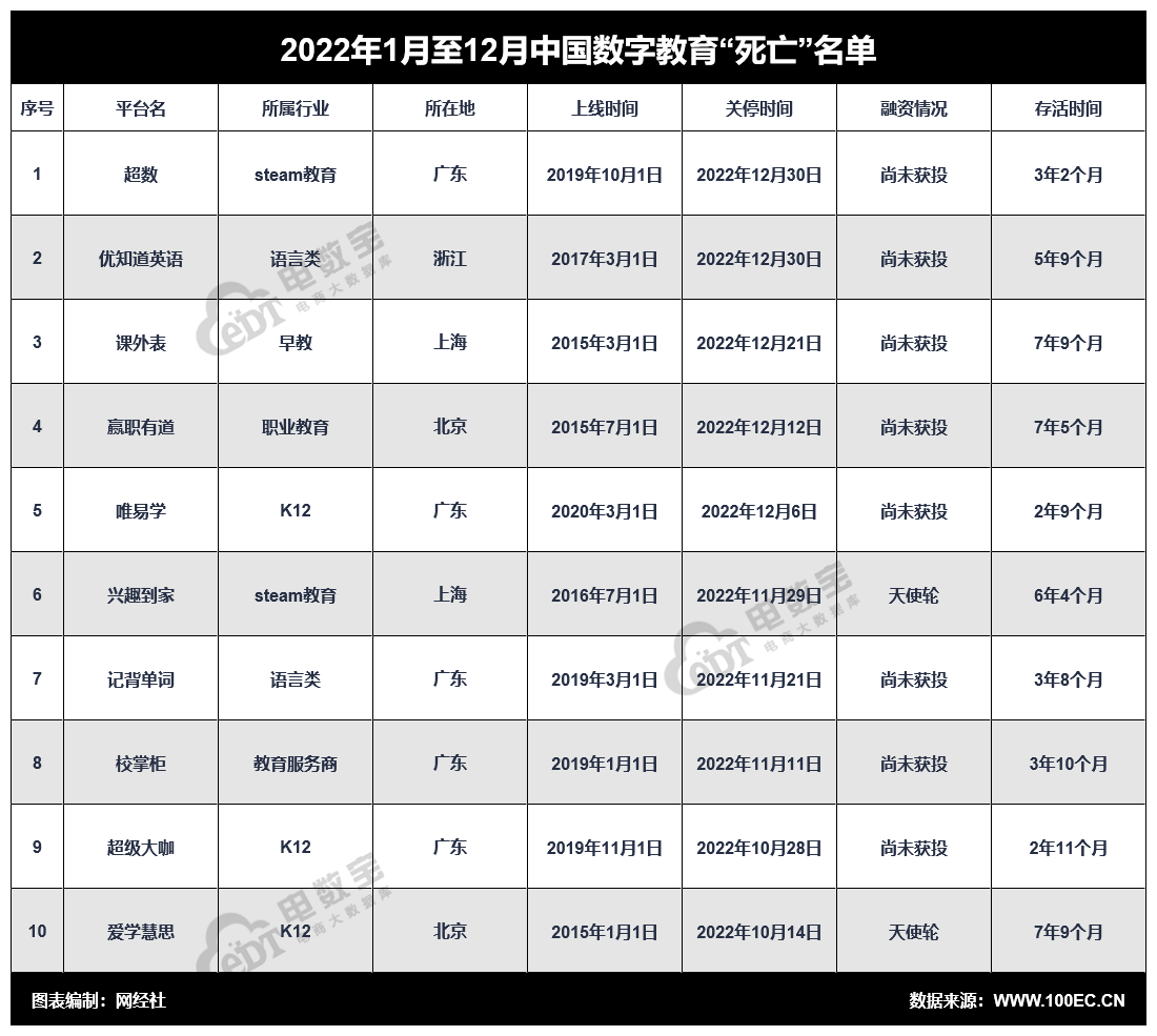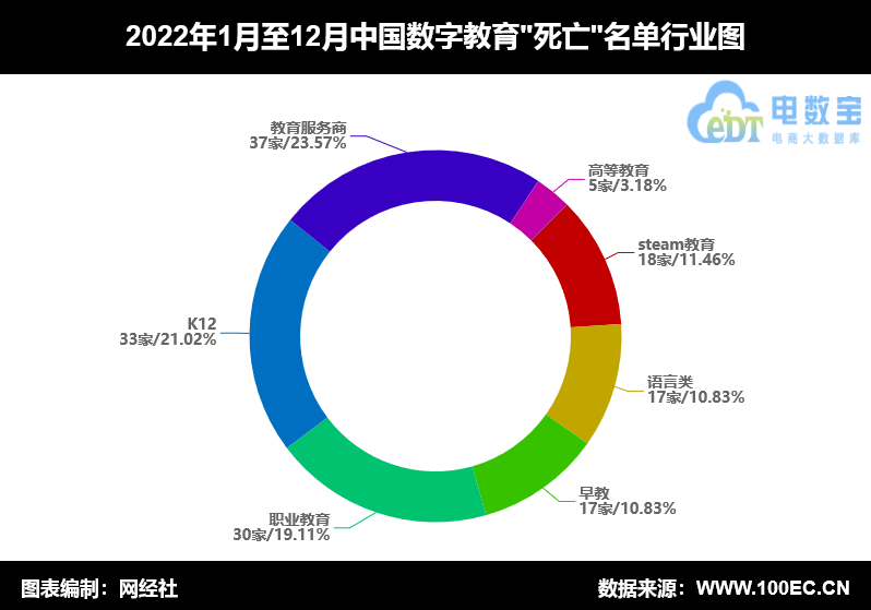 2022年数字教育公司“死亡”数157家。其中,K12在线教育33家;在线职业教育“死亡”数30家;教育服务商“死亡”数37家;在线早教“死亡”数17家;在线语言类教育“死亡”数17家;在线steam教育“死亡”数18家;在线高等教育“死亡”数5家。