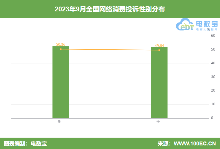 据“电诉宝”显示,9月男性用户投诉比例为50.36%,女性用户投诉比例为49.64%。