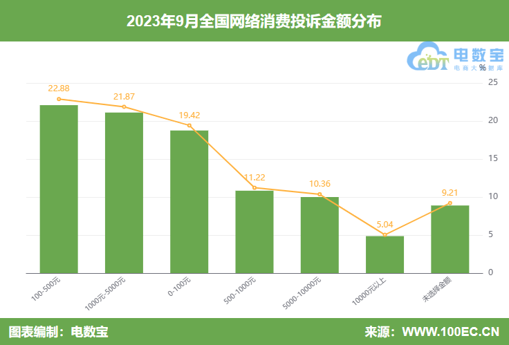 据“电诉宝”显示,9月投诉金额分布主要集中在100-500元(22.88%)、1000-5000元(21.87%)、0-100元(19.42%)、500-1000元(11.22%)、5000-10000元(10.36%)、10000元以上(5.04%)、未选择金额(9.21%)。