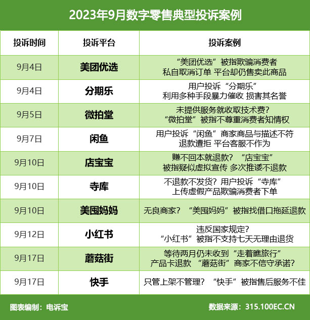 通报:微拍堂 闲鱼 小红书 蘑菇街 店宝宝等入选9月全国数字零售十大典型投诉案例