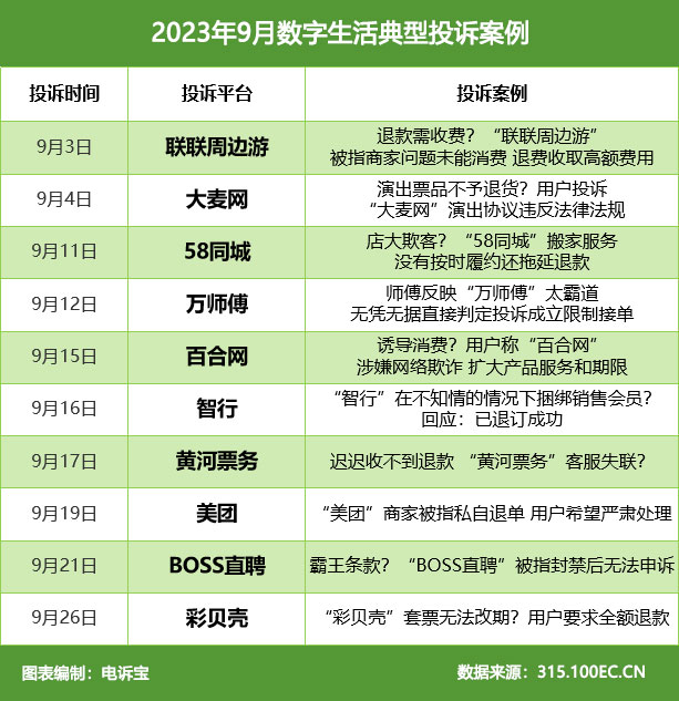 在数字生活消费领域,据“电诉宝”受理用户维权案例,我们从中选取十大典型投诉案例,涉及联联周边游、大麦网、58同城、万师傅、百合网、智行、黄河票务、美团、BOSS直聘、彩贝壳。
