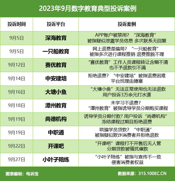 在数字教育消费领域,据“电诉宝”受理用户维权案例,我们从中选取十大典型投诉案例,涉及深海教育、一只船教育、赛优教育、中安建培、大塘小鱼、潭州教育、尚德机构、中职通、开课吧、小叶子陪练。