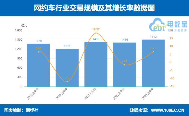 据网经社“电数宝”大数据库监测数据预计,2023上半年网约车市场规模约为1512亿元,同比增长6.77%。
