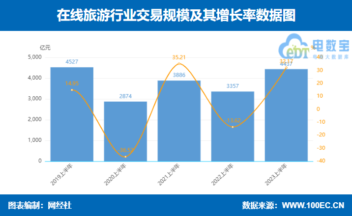 据网经社“电数宝”大数据库显示预计,2023上半年在线旅游市场规模为4437亿元,同比增长32.17%。