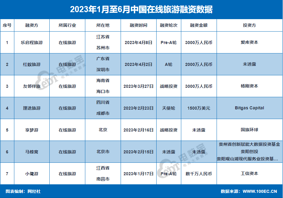 “电数宝” 显示,2023年上半年在线旅游融资事件数共7起,融资总金额超2.02亿元。融资方包括:乐启程旅游、红蚁旅游、友邻伴旅、理途旅游、享梦游、马蜂窝、小鹭游。
