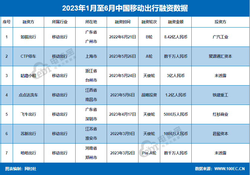 “电数宝”(DATA.100EC.CN)显示,2023年上半年移动出行融资事件数共7起,融资总金额超13.6亿元。融资方包括:如祺出行、CTP停车、咕噜小租、点点达洗车、飞牛出行、苏新出行、哈哈出行。