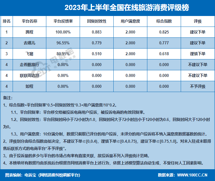 据“电诉宝”显示, 2023上半年国在线旅游领域的投诉平台中,携程、去哪儿获“建议下单”评级;飞猪获“谨慎下单”评级;走着瞧旅行、联联周边游获“不建议下单”评级;如程获“不予评级”。