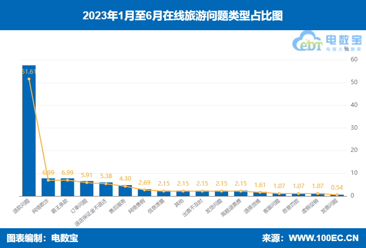据 “电诉宝” 显示, 2023上半年在线旅游热点投诉问题依次为退款问题、网络欺诈、霸王条款、订单问题、退店保证金不退还、售后服务、网络售假、信息泄露、出票不及时、高额退票费、退换货难、客服问题、恶意罚款、虚假促销、发票问题。