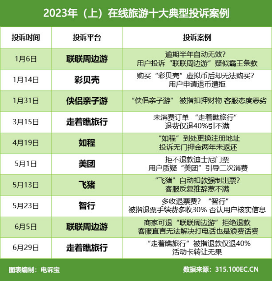 据网络消费纠纷调解平台“电诉宝”(315.100EC.CN)受理用户维权案例显示,2023上半年全国在线旅游领域的投诉事件按投诉量排序依次为飞猪、联联周边游、去哪儿、走着瞧旅行、如程、携程、侠侣亲子游、同程、旅划算、骑驴游、马蜂窝、途家、彩贝壳、穷游网、驴妈妈。