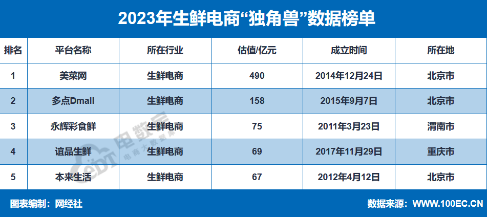 据“电数宝”电商大数据库显示,2023年生鲜电商“独角兽”为5家,分别是美菜网、多点Dmall、永辉彩食鲜、谊品生鲜、本来生活,估值分别为490亿元、158亿元、75亿元、69亿元、67亿元,总估值达929亿元。