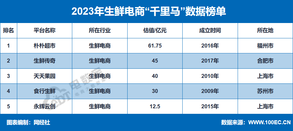 据“电数宝”电商大数据库显示,2023年生鲜电商“千里马”5家,分别是朴朴超市、生鲜传奇、天天果园、食行生鲜、永辉云创,估值分别为61.75亿元、45亿元、40亿元、30亿元、12.5亿元,总估值达189.25亿元。