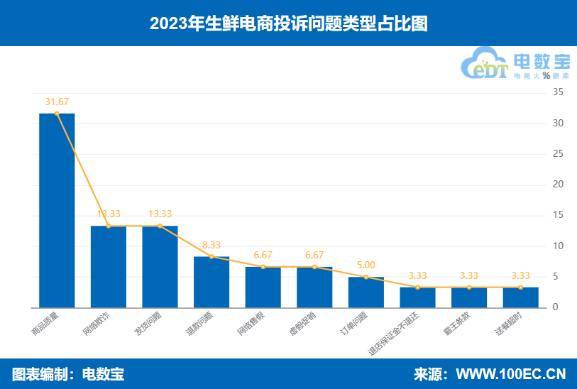 国内知名网络消费纠纷调解平台“电诉宝”受理用户维权案例显示,商品质量、网络欺诈、发货问题、退款问题、网络售假、虚假促销、订单问题、退店保证金不退还、霸王条款、送餐超时等是2023年生鲜电商&社区团购投诉的主要问题。