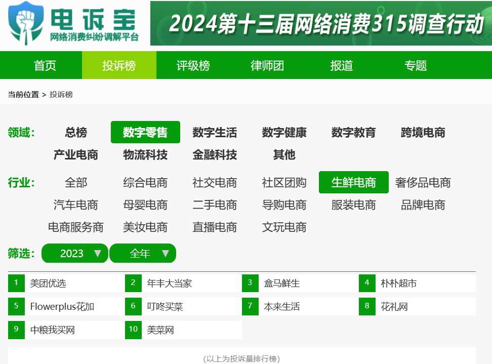 据国内知名网络消费纠纷调解平台“电诉宝”显示,2023年依据投诉量来排名,涉及的生鲜电商平台有美团优选、年丰大当家、盒马鲜生、朴朴超市、Flowerplus花加、叮咚买菜、本来生活、花礼网、中粮我买网、美菜网等。此外,投诉榜中涉及的社区团购平台主要为兴盛优选。