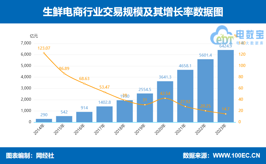 据网经社“电数宝”(DATA.100EC,CN)电商大数据库显示, 2023年生鲜电商交易规模达到6424.9亿元,同比增长14.7%。