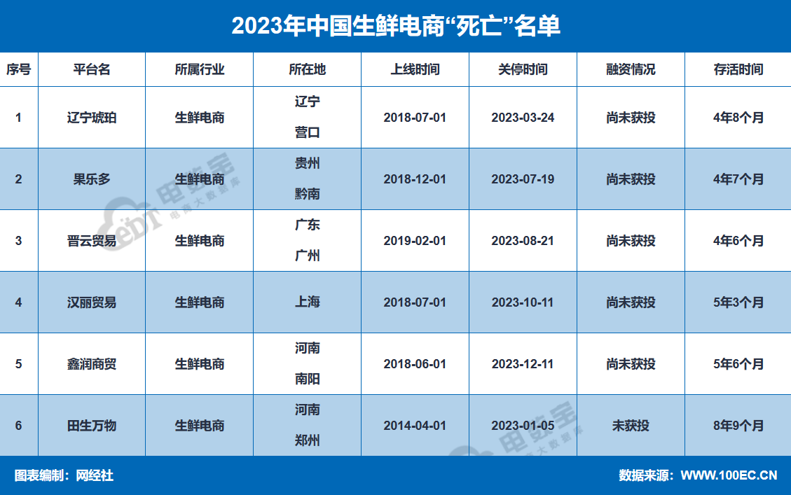 据网经社“电数宝”电商大数据库显示,2023年生鲜电商“死亡”企业共6家,分别为辽宁琥珀、果乐多、晋云贸易、汉丽贸易、鑫润商贸、田生万物。