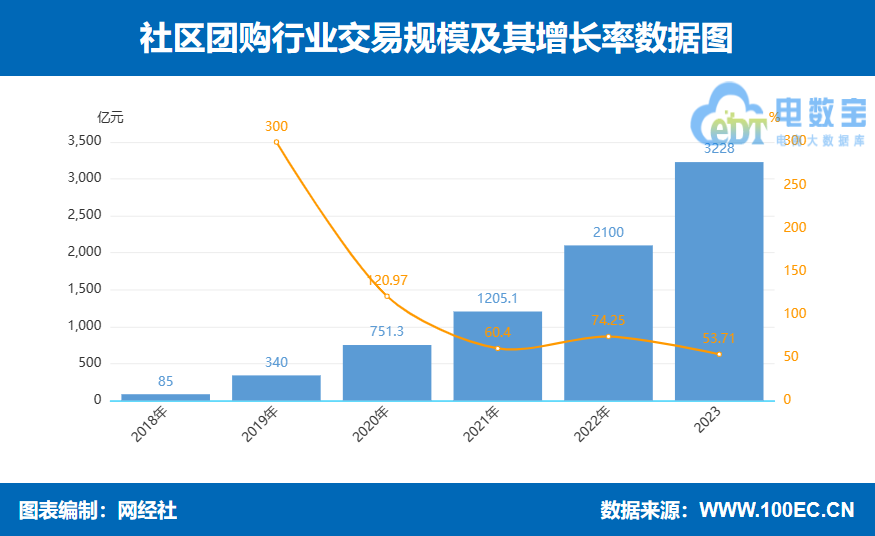 据网经社“电数宝”(DATA.100EC,CN)电商大数据库显示, 2023年社区团购交易规模达到3228亿元,同比增长53.71%。