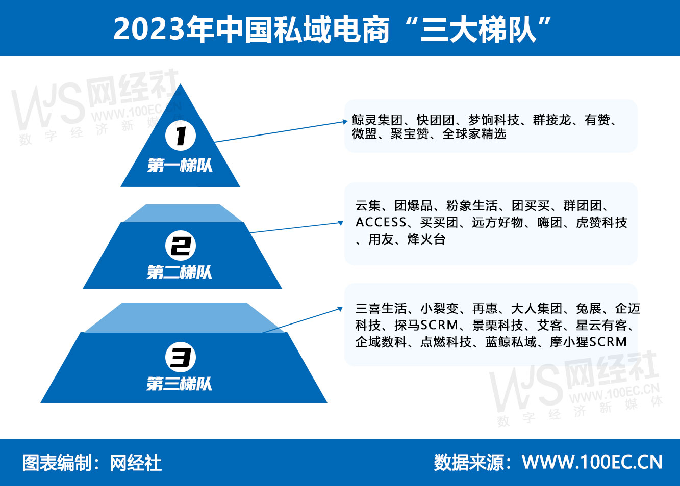 网经社根据销售额及公司体量,将2023年中国私域电商分为“三大梯队”: