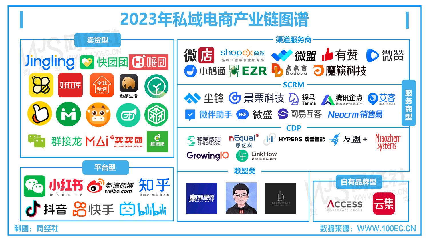 目前私域电商玩家有:1.平台型:微信、小红书、微博、知乎等;2.卖货型:鲸灵集团、蜂享家、好衣库、快团团、群接龙、啊呀团、团团团等;3.自有品牌型:ACCESS、云集;4.服务商型:渠道服务商:微店、微盟、有赞;SCRM:尘锋、景栗科技;CDP:神策数据、恩亿科、嗨普智能;联盟类:秦师哥团长联盟、快团联盟、落地母婴等。